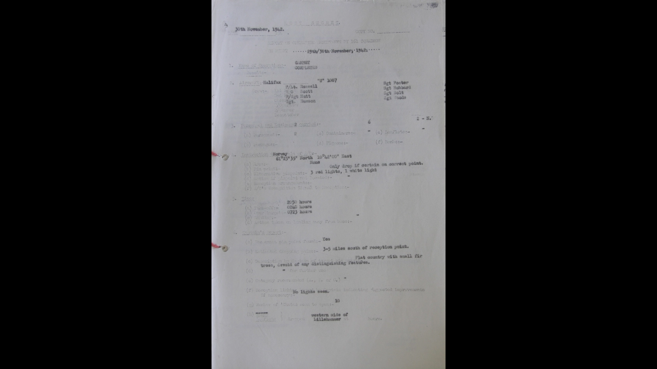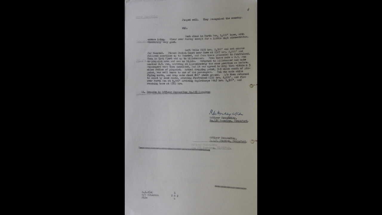 - Left Wells 21:22, 2500', and set course for Hansted. Struck Danish coast near Nove at 23:27 hrs, 2000' and followed coastline up to Hansted, and from there proceed to Jomfruland. Then to Tyrifjord and up to Lillehammer. From there made a DR run to pin point area and saw no lights. Returned to Lillehammer and made another DR run, arriving approx. the same position as before. Passengers where then consulted and it was agreed to drop them within 5 miles radius of pin point. Actual dropping point, 3-5 mils South of pinpoint, was well known to one of the passengers. Run was made while flying north, and drop was made 800 ' ABG. A/c then returnes to coast by same route, crossing Jomfruland 03:32 hrs. 6000 ', and flew over North Sea at 9000 ' arriving Maplethorpe 06:47 hrs, 1500 ' and reaached base at 07:23.