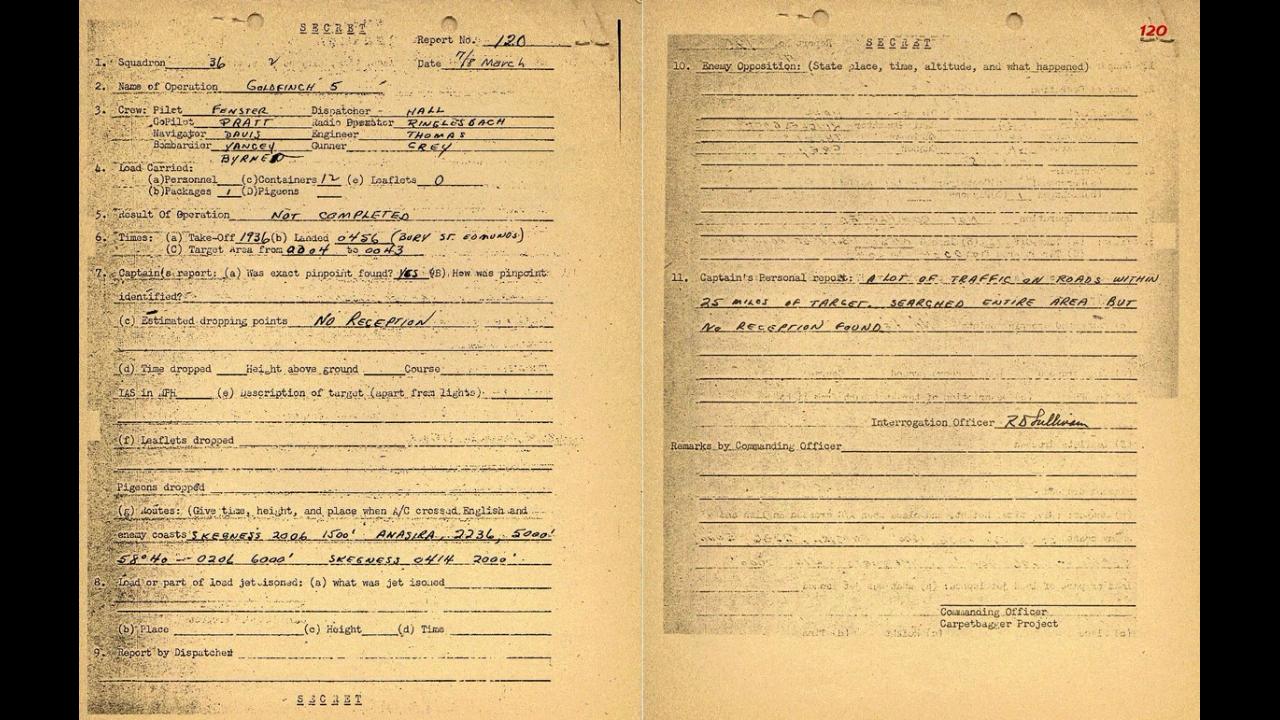 "Fensters Liberator oppholder seg over dropp plassen til de er sikre på at de ikke har oversett noen ting. Det er jo for galt å dra hjem uten å ha løst oppdraget! Etter å ha sjekket posisjonen flere ganger og sirklet over område innser de at de må returnere. Intet lyssignal fra bakken er oppdaget til tross for fint klart vær og at samtlige av mannskapene sitter og stirrer ut gjennom vinduene. Faren for tyske nattjagere er også tilstede. Fensters får en ny rute hjemover. De blir beordret til å lande på flybasen ved Bury St. Edmunds i Suffolk, litt Øst for deres base på Alconbury som er overanstrengt etter stor aktivitet denne natten. Det er flere enn motstandsbevegelsen i Norge som får forsyninger denne natta. Etter en perfekt landing og en god natts søvn flyr de dagen etter den lille turen til vestover mot Alconbury hvor Fenrik Fenster blir debriefet umiddelbart etter landing."