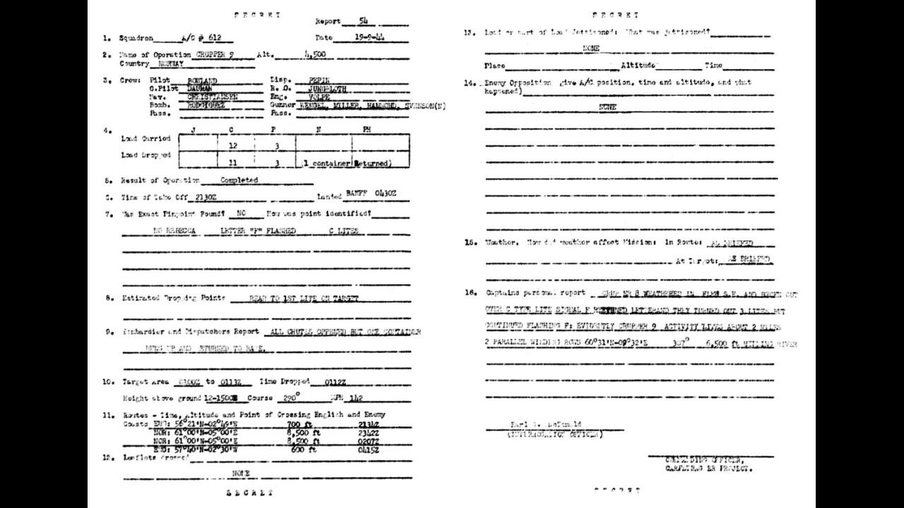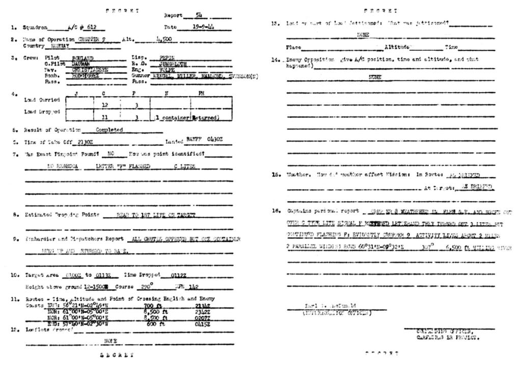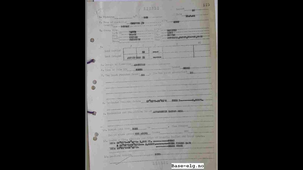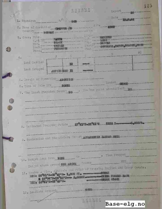 2. 60d 25' 25" N 09d 54' 05" E Norway 1409th AAF Base Unit Det 1 BP 54 Bowland 19/20Sep44 Crupper 9 11C, 3P 0100 - 0113. 1 container returned. Landed RAF BANFF