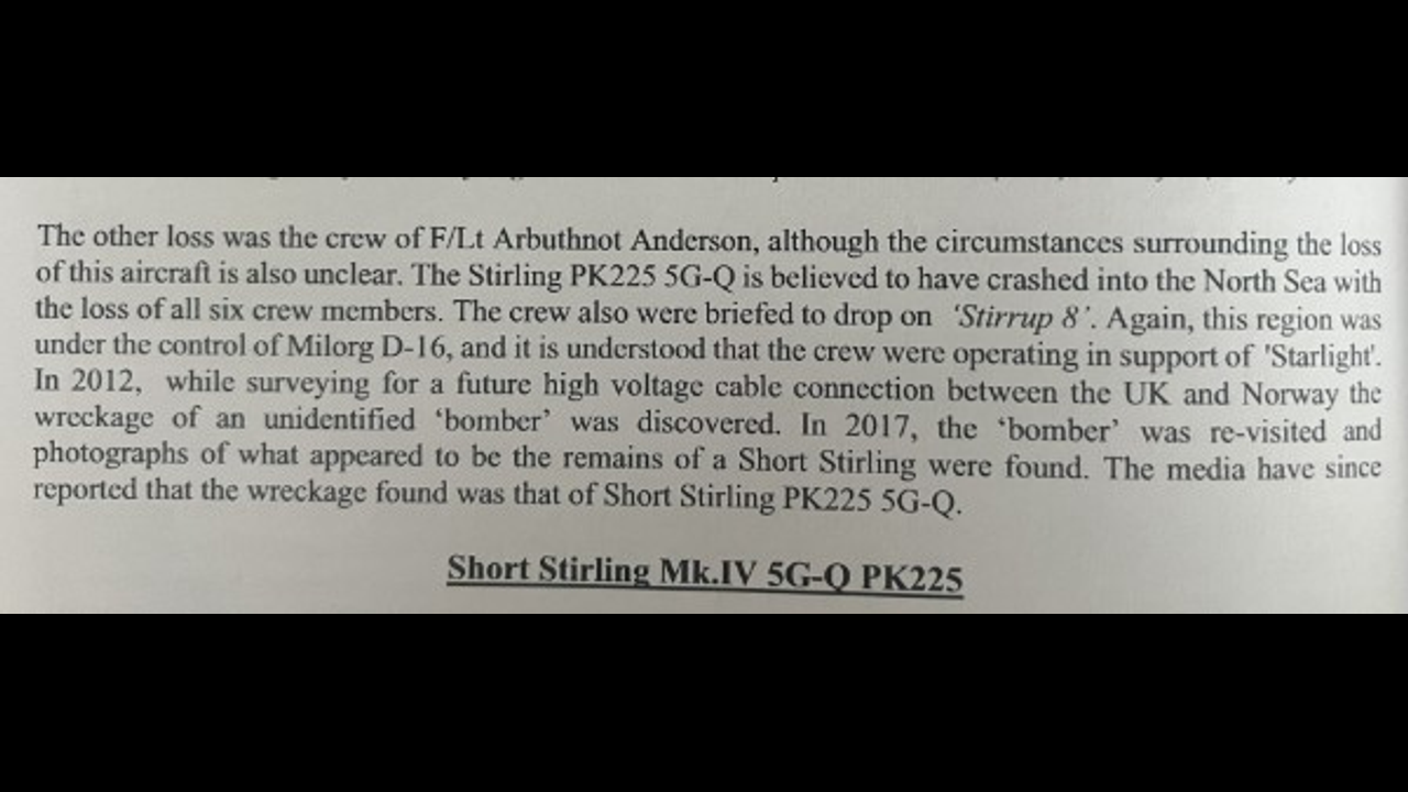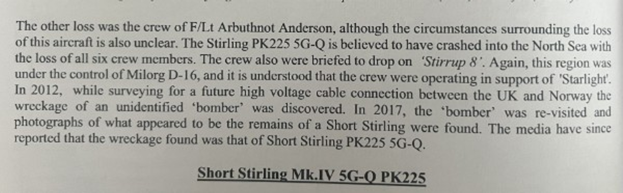 "The other loss was the crew of F/Lt Arbuthnot Anderson, although the circumstances surrounding the loss of this aircraft is also unclear. The Stirling PK225 5G-Q is believed to have crashed into the North Sea with the loss of all six crew members. The crew also were briefed to drop on Stirrup 8. Again, this region was under the control of Milorg D-16, and it is understood that the crew were operating in support of "Starlight In 2012, while surveying for a future high voltage cable connection between the UK and Norway the wreckage of an unidentified ‘bomber’? was discovered. In 2017, the ‘bomber’? was re-visited and photographs of what appeared to be the remains of a Short Stirling were found. The media have since reported that the wreckage found was that of Short Stirling PK225 SG-Q."