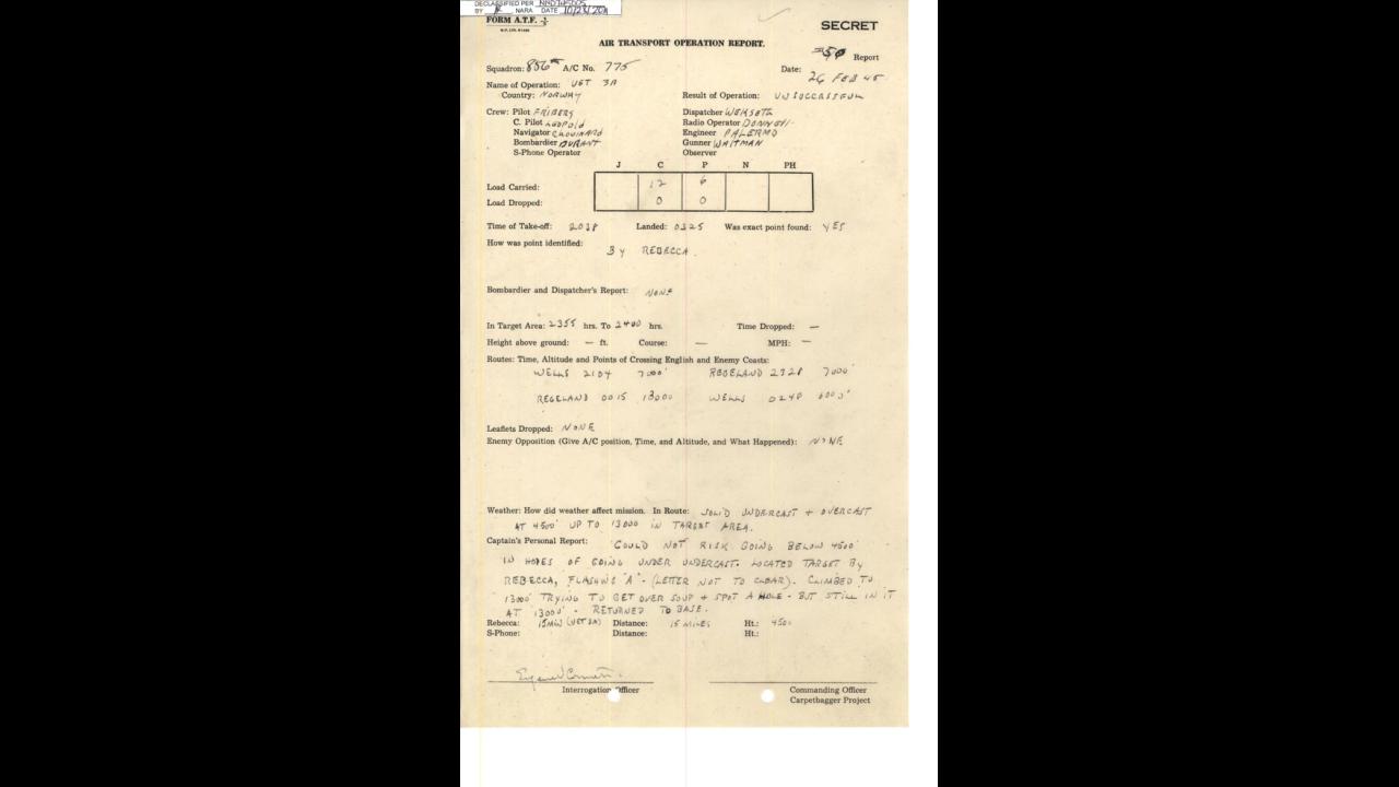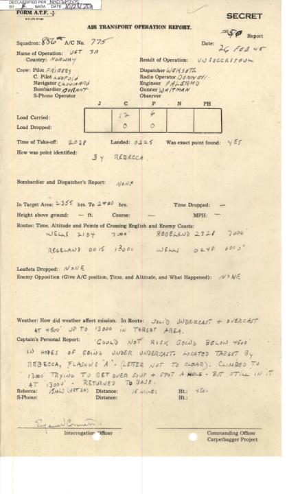 Solid undercast + overcast at 4500' up to 13000. in target area. Could not risk gouing below 4500'.in hopes of going undercast. Located target by REBECCA, Flashing "A" (letter not to clear). Climbed to 13000', trying to get over soup + spot a hole - but still in it at 13000æ. Returned to base.