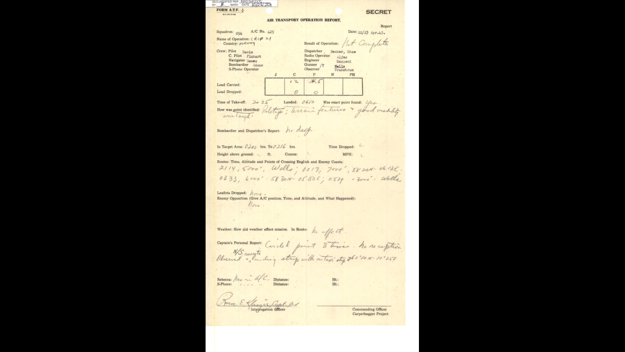 2. Whole load jettisoned in North Sea. Heavy weather over Norway with conciderable icing cause up to turn around about 50 miles inland. Were able to pinpoint ourselves also. Werent able to see to **** *****. Dropped load on return in North sea account of 1 engine out 220 miles out from English coast. Lost all the oil in the engine so had to feather it.
