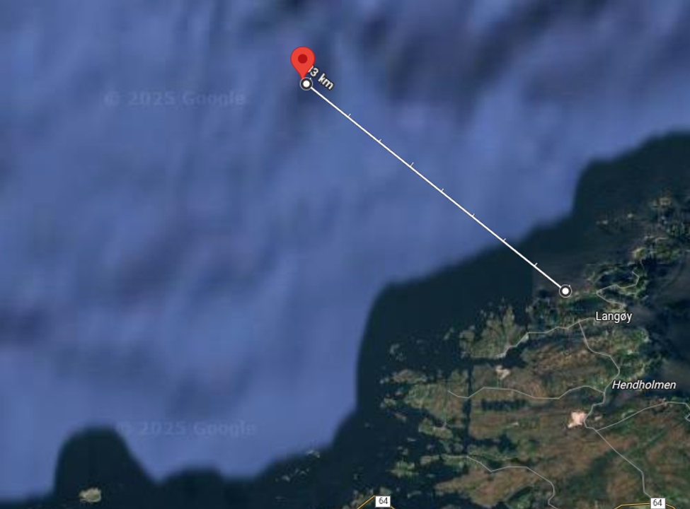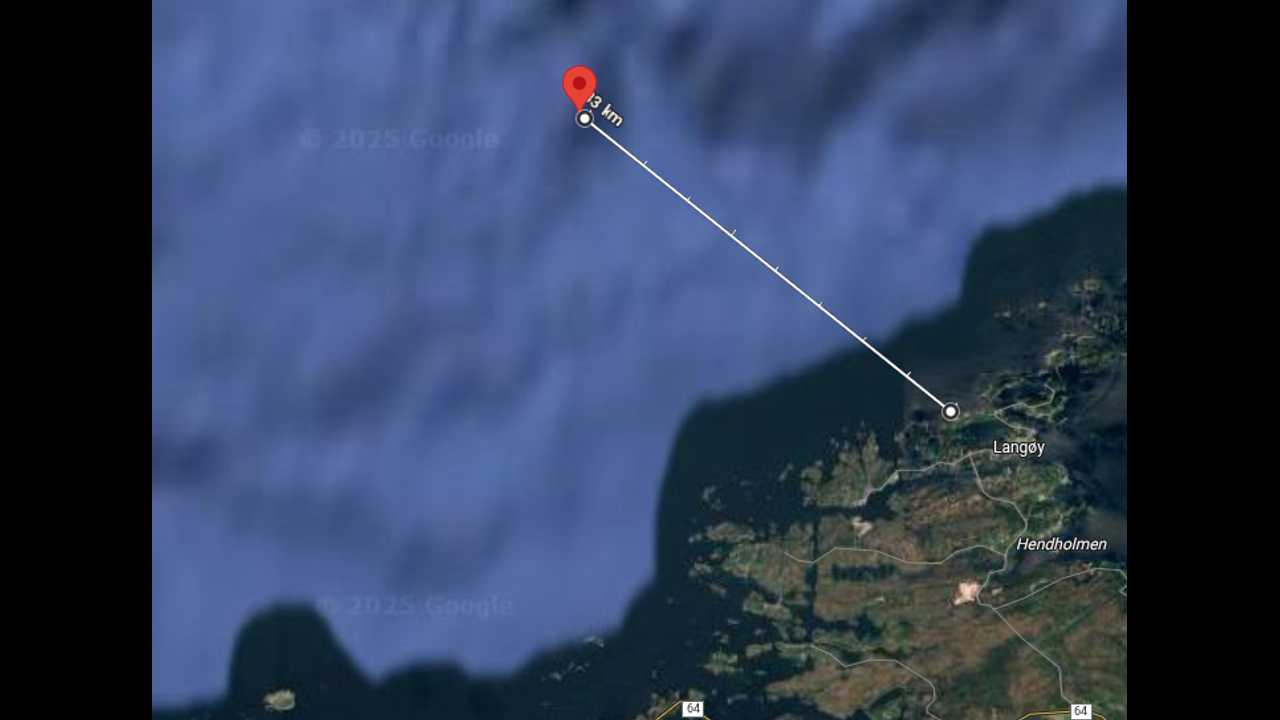 7° 20' 30" east. (8,33 km NW of Langøy-se kart under).Agents made for Langø in motor dinghy.