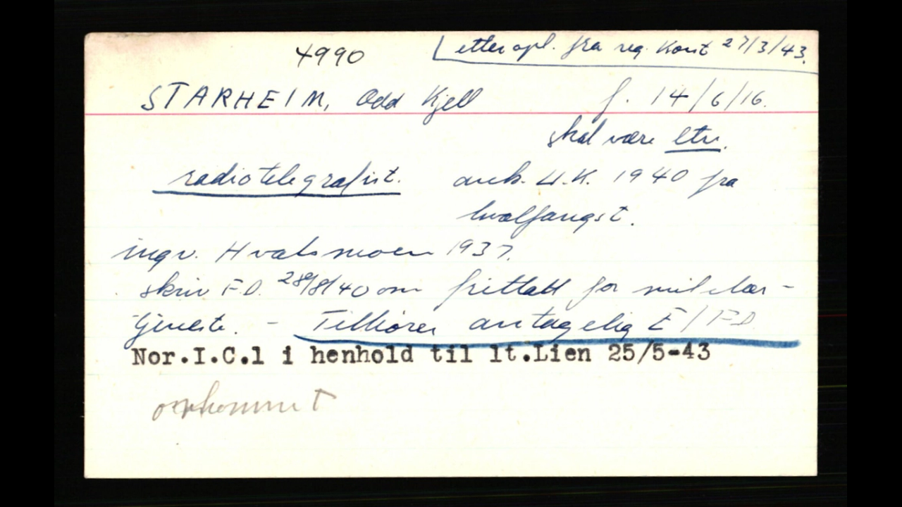 All three were recruited for work in Norway and sent for training. His two friends with one other were sent back in November, 1940, but on arrival in Norway were captured and executed. Starheim pressed to be sent out to