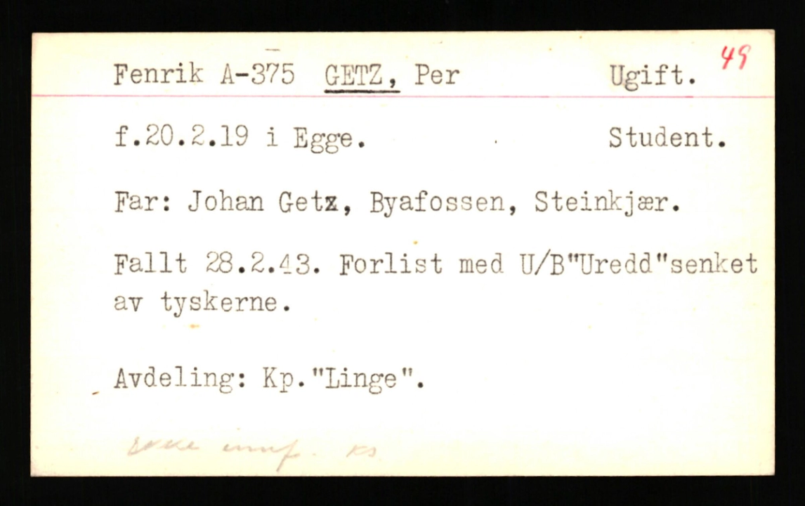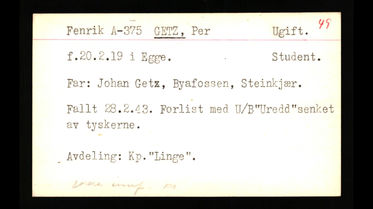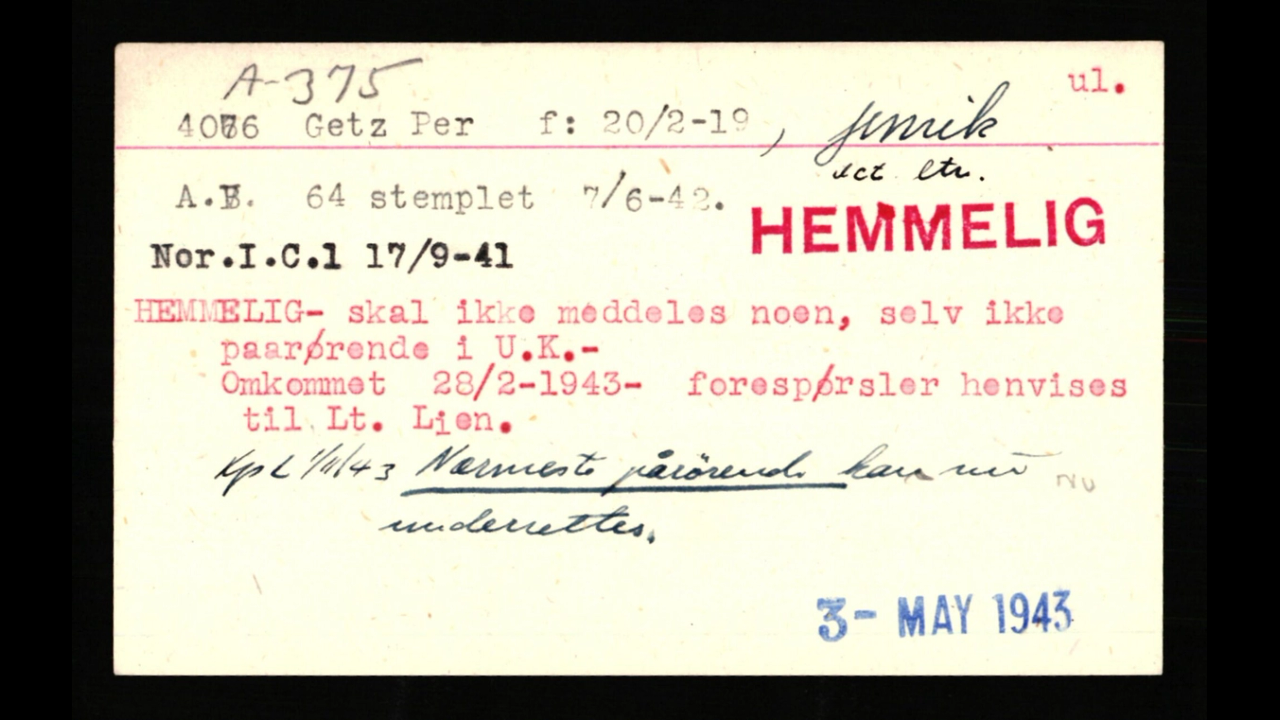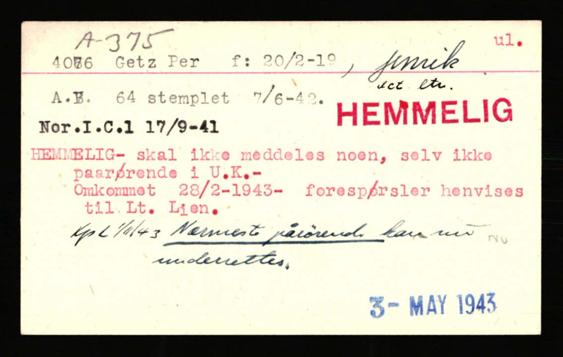 GETZ, Per. Løytnant, født 20.2.1919 i Oslo. Getz gikk kavaleriets befalskole og deltok i kampene i Norge. Han tok så fatt på den lange reisen til Storbritannia som førte ham over Moskva, Istanbul, Palestina, Egypt og rundt Afrika til Cape Town der han fikk skipsleilighet til Glasgow med ankomst i Skottland 8. september 1941.