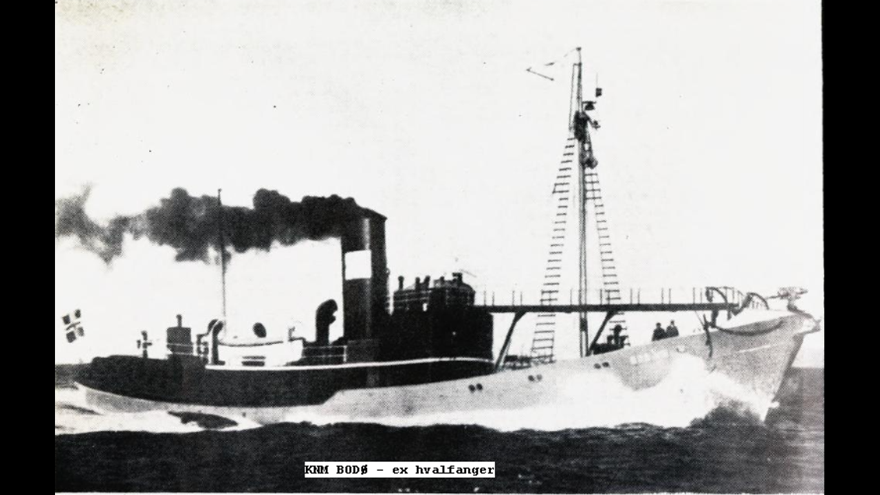 KNM BODØ - Patruljebåt - Liverpool Local Escort Force, 7.11.1941 - 28.10.1943. 54. M.T.B, flotilje. 1943-1944, 30/10/44 -20/2/45 A.C.O.S in Scapa Flow, 20/2/45 to end: 1. Minesveiperdivisjon