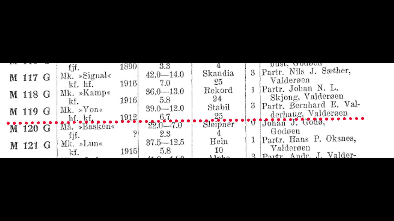 Reg oktober 1920 som VON M-119-G for Bernhard Valderhaug. Valderøen